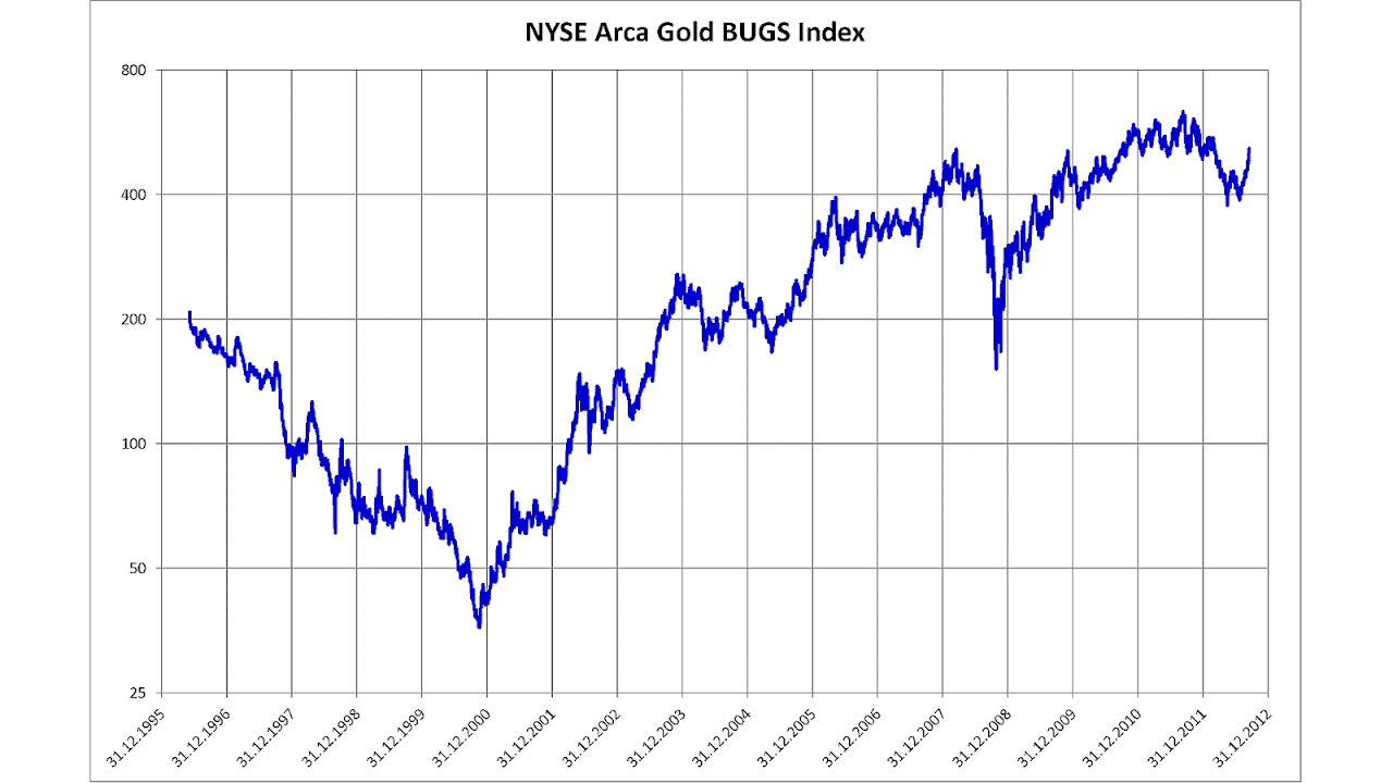 The NYSE Arca Gold BUGS Index is a modified equal dollar weighted index of companies involved in gold mining. BUGS stands for Basket of Unhedged Gold Stocks. It is also referred to by its ticker symbol "HUI". The HUI Index and Philadelphia Gold and Silver Index (XAU) are the two most watched gold indices on the market. The main difference between them is that the HUI Index takes into account only gold mining stocks whereas the XAU Index includes both gold and silver producers. The Gold BUGS Index was designed to provide significant exposure to near term movements in gold prices by including companies that do not hedge their gold production beyond 1.5 years. The HUI Index was developed with a base value of 200.00 as of March 15, 1996. The AMEX Gold BUGS Index currently consists of 15 of the largest and most widely held public gold production companies. Since bottoming in late 2000, HUI went on to be the top-performing US stock sector of the decade, rising by about 1600%.